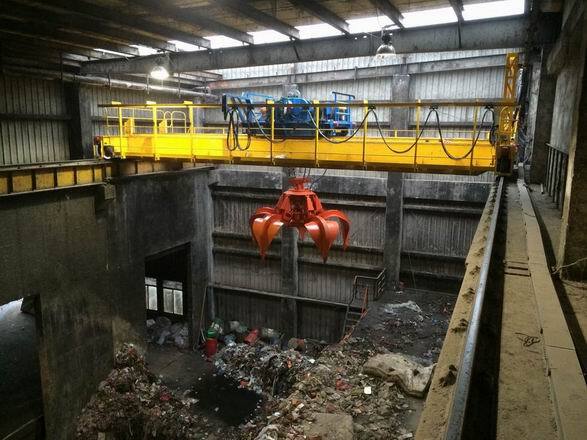 垃圾吊运行中情况。  垃圾抓斗式起重机俗称垃圾吊,是各种垃圾焚烧发电厂供料系统的核心设备,位于垃圾储存坑的上方,主要承担对垃圾的取料、搬运、投料、称重计量等作业。  由于现场使用环境恶劣等因素,对垃圾吊整体质量要求非常高,我公司生产的垃圾抓斗式起重机能执行严格的搬运及投料作业,确保垃圾焚烧发电厂的正常作业,可以根据配置实现起重机的手动、半自动运行;实现一键投料、一键泊车。